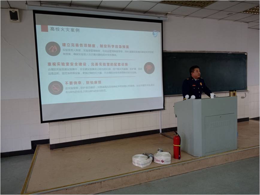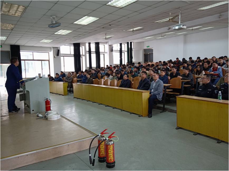 为进一步加强我校师生的消防安全意识,普及消防安全知识,2019年4月12日下午,化工学院委托校保卫处邀请马鞍山市花山区消防救援大队丁浩参谋为学院师生进行了消防安全知识培训及消防演练,学院教师、研究生、大四本科生等200余人参加了活动。