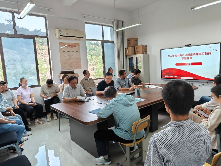 2025年5月26日下午,体育彩票 副院长(主持工作)韩新亚在应用化学系党支部,开展以《八项规定:长期有效的铁规矩、硬杠杠》为题的专题党课活动。活动由应化系党支部书记吴孔林主持,全体党员及系室干部参加学习。