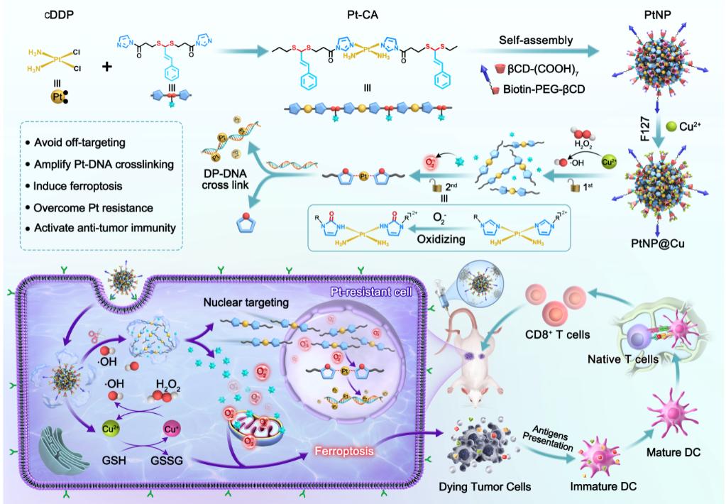 铂类药物的疗效常受限于低利用率、副作用及铂耐药性。本研究开发了一种双锁保护的Pt(II)纳米药物PtNP@Cu,其通过级联催化-氧化还原反应实现顺铂(cDDP)的解锁,从而在肿瘤细胞核内实现顺铂的原位激活并诱导铁死亡。该设计避免了活性Pt(II)物种在正常细胞或癌细胞胞质中的过早释放,确保Pt-DNA交联的肿瘤特异性最大化。同时,级联反应诱导的谷胱甘肽(GSH)耗竭与活性氧(ROS)生成导致癌细胞铁死亡,进一步减少GSH介导的顺铂解毒作用,克服铂耐药性并增强免疫原性,最终实现高效肿瘤特异性化疗及体内抗肿瘤免疫。此工作为全面解决铂类药物利用率低、副作用及耐药性问题提供了新策略,并为化学-免疫治疗提供了新思路。