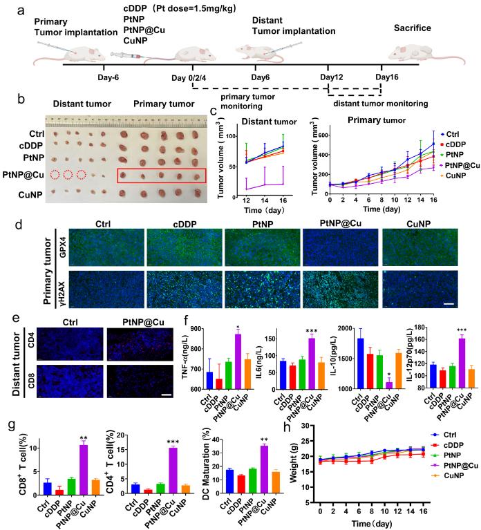 铂类抗癌药物(如顺铂)因“脱靶效应”导致疗效受限,主要表现为药物利用率低、副作用显著及耐药性问题。现有研究虽通过靶向递送或增强活性氧(ROS)等策略改善效果,但仍难以避免细胞质中铂药物的过早释放及谷胱甘肽(GSH)介导的解毒。为解决这一难题,团队开发了一种双锁保护的铂(II)纳米药物PtNP@Cu,其通过级联催化-氧化还原反应实现顺铂(cDDP)的肿瘤特异性“核内原位激活”,并伴随癌细胞铁死亡诱导,从而显著提升化疗-免疫治疗效果。