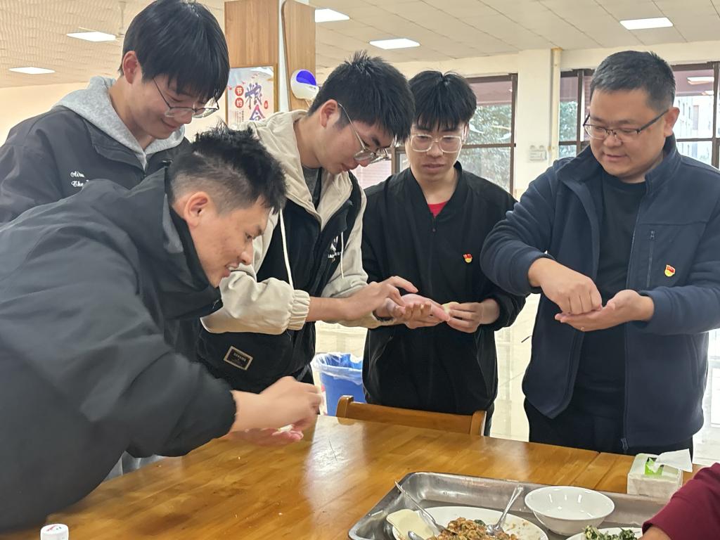 活动最后。支部成员与后勤处的老师、厨师们齐聚一堂,纷纷挽起袖子,投入到包饺子的活动中。后勤处的老师们手法娴熟,倾囊相授;同学们兴致勃勃,认真学习。
