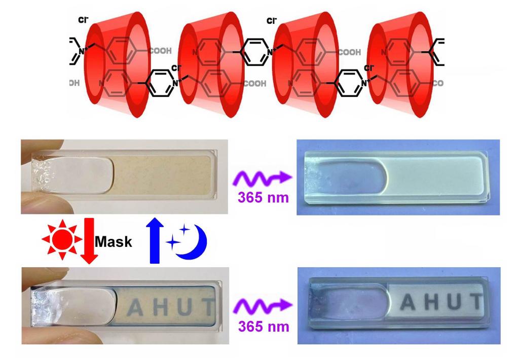 (主客体结构及超分子水凝胶的光致变色与可控荧光性能的示意图)