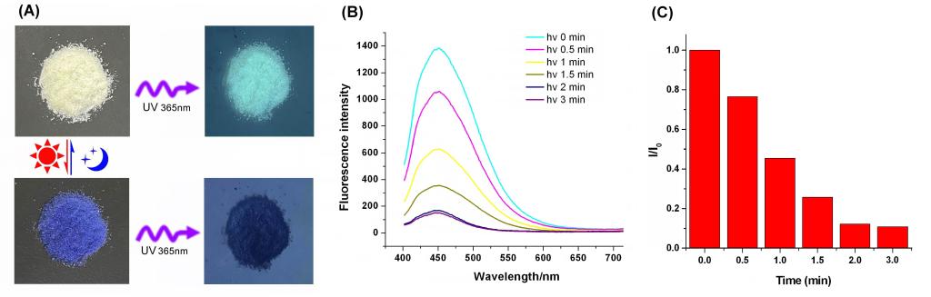 (A:固体粉末显示光致变色及荧光发射