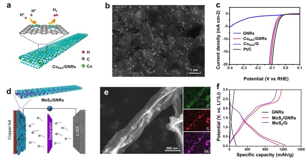 这些新型的石墨烯纳米带基功能材料在新能源器件中表现出优异的储能和催化性能。例如,氮/磷/氟共掺杂的石墨烯纳米带材料作为非金属催化剂,在电催化氧还原反应中表现出接近商业化铂碳的催化活性。钴单原子修饰的石墨烯纳米带材料在电催化产氢反应中的塔菲尔斜率仅为48 mV/dec,展现出与商业化铂碳(44 mV/dec)接近的反应动力学。石墨烯纳米带包裹二硫化钼得到的复合材料,在电化学储锂方面表现出良好的活性,在0.1A/g电流密度下展现出1210 mAh/g的比容量,同时展现出良好的循环稳定性,经过500次循环,容量仅衰减18.7%。石墨烯纳米带包裹聚苯胺纤维得到的复合材料,在超级电容器领域表现出良好的比容量(734 F/g)和倍率性能。石墨烯纳米带包裹二硫化硒得到的复合带状材料,作为钠离子电池正极材料,表现出486 mAh/g的电化学储钠性能。这些功能材料的开发,显著提升了石墨烯纳米带及其功能材料的应用场景。