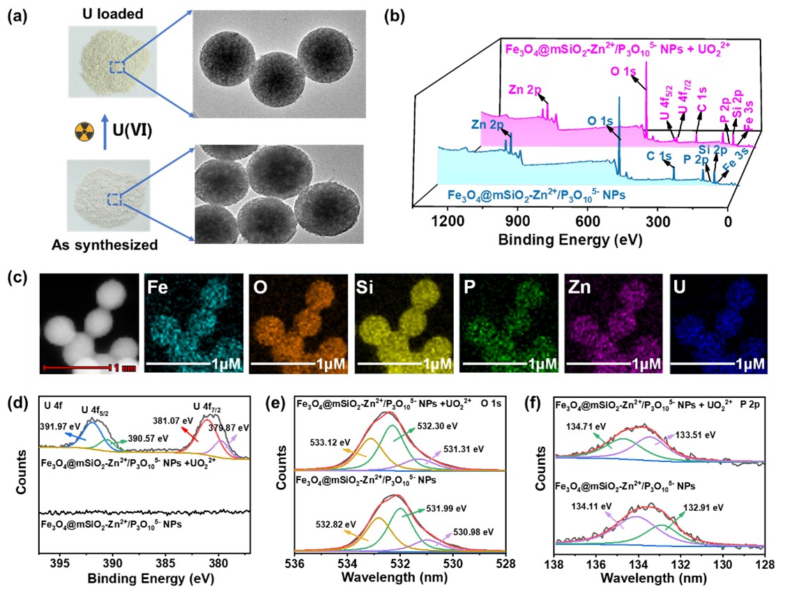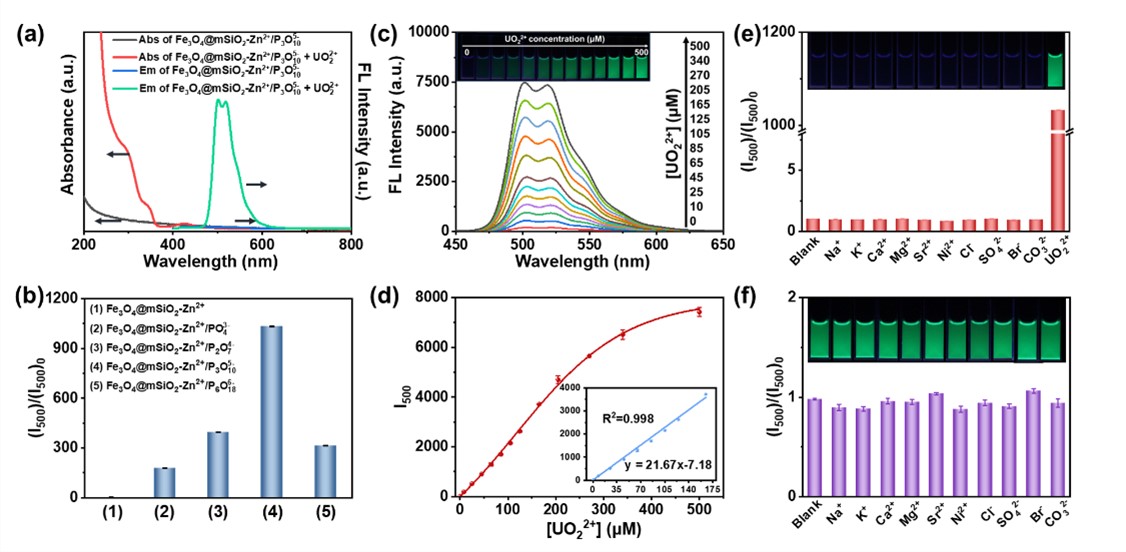 研究基于前期实验结果和理论基础,提出出一种通用方法,用于合成一系列磷酸盐阴离子(如:PO43-、P2O74-、P3O105-和P6O186-)修饰的磁性介孔二氧化硅纳米颗粒(Fe3O4@mSiO2-Zn2+NPs)。磁性颗粒较大的介孔比表面积和丰富的磷酸基团为捕获U(VI)离子提供了强力的铀结合位点,其中三聚磷酸离子功能团修饰的磁性介孔二氧化硅纳米颗粒(Fe3O4@mSiO2-Zn2+/ P3O105-NPs)的吸附容量高达885.90 mg·g-1(298 K),远高于未改性或其他磷酸盐阴离子改性的磁性介孔二氧化硅纳米颗粒。同时,磷酸盐阴离子结合位点和介孔大比表面积极大地限制了U(VI)离子的荧光振动失活,吸附后的绿色荧光迅速增强(180秒内),从而实现对U(VI)离子的可视化检测,其最低检测限为4.5 nmol·L-1),远低于世界卫生组织(WHO)规定的饮用水标准。即使经过5次循环,该吸附剂仍能保持 80.21% 的原始吸附容量,在检测和去除海水中的U(VI)离子方面表现出优越性。上述研究成果为进一步开发集检测、吸附、除去等多功能材料提供了崭新的研究思路,有效维护突发情况下人们的生命与健康安全,促进核工业的可持续发展。