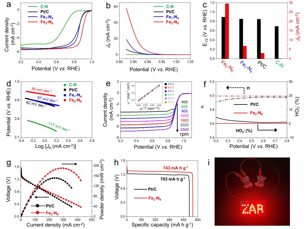 氮配位的铁-铁双原子对相较于氮配位的铁单原子和商业铂碳催化剂,在碱性介质中表现出更高的起始电位(0.95 )和半波电位(0.90),以及更高的动力学电流密度和更低的塔菲尔斜率。此外,基于氮配位的铁-铁双原子对的柔性锌空气电池在平展和弯曲状态下均能点亮发光二极管,显示出优异的机械稳定性和应用潜力。这些结果验证了氮配位的铁-铁双原子对作为高效氧还原催化剂和柔性电池电极的卓越性能。