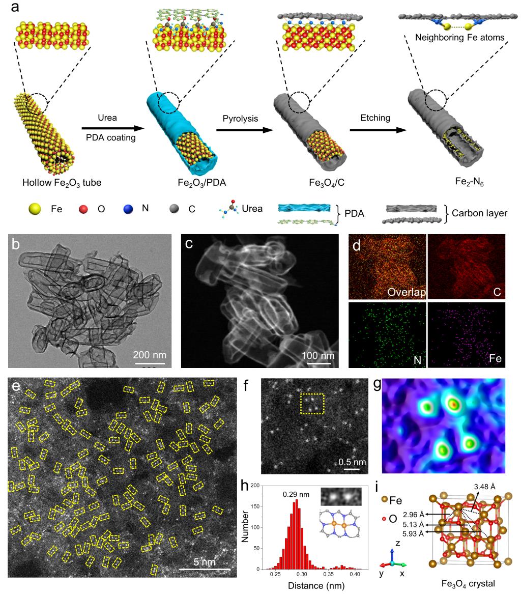 四氧化三铁晶体单元中,原子之间有四种距离:2.963.485.135.93 。尿素高效地锚定了相距2.96原子,形成具有近邻关系的铁-铁双原子对催化剂。该催化剂中具有近邻关系的铁-铁原子对纯度高达98%,铁原子的质量含量为2.36%