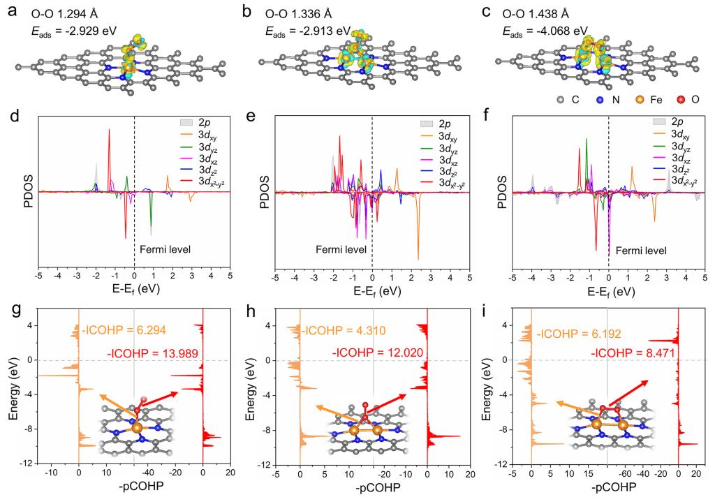通过密度泛函理论计算分析了基催化剂中的氧还原反应机制,发现氧氧双键的活化是反应的速率决定步骤。氮配位的铁单原子氮配位的铁-铁双原子对的氧分子吸附构型表明,氮配位的铁-铁双原子在平行吸附模式下对氧气的活化最为有效,具有更强的化学吸附能力和显著减弱的氧氧键。自旋极化态密度分析显示氮配位的铁-铁双原子对d带中心更接近费米能级,表明更强的吸附能力。进一步分析表明,氮配位的铁-铁双原子对在平行吸附时,氧氧键显著减弱,促进了氧的活化。