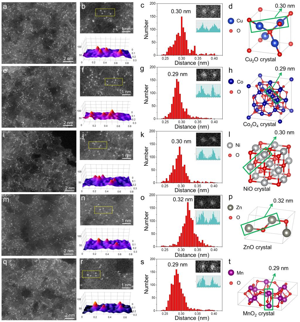 为了验证界面固定方法是否可以拓展到其他邻近的金属-金属双原子对催化剂分别以氧化亚铜、四氧化三铁氧化镍氧化锌二氧化锰为金属源,以尿素为配体合成近邻金属-氮催化剂。通过一系列表征确认了产物中没有簇或纳米颗粒的存在相邻金属原子的距离与其金属氧化物对应物的距离一致,这些结果证实了我们的合成策略在氮配位的近邻金属-金属原子对催化剂制备中的普适性。