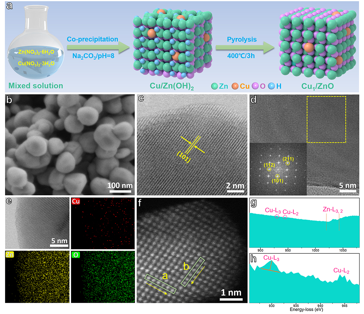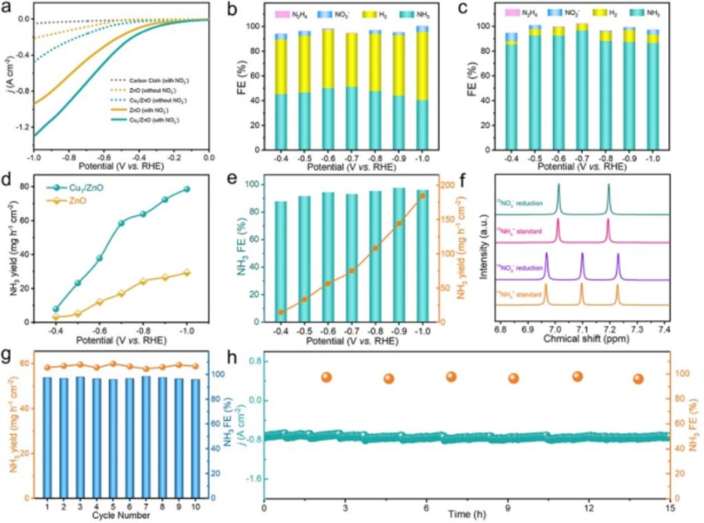 为了解决这一难题,曾杰教授团队开发了一种ZnO载体分散的Cu单原子合金氧化物催化剂(Cu1/ZnO)。该催化剂体系中,原子级分散的Cu位点增强了对硝酸根中间体(*NO3)的吸附,Cu位点协同ZnO载体中Zn位点促进了水解离生成活性氢并且抑制了活性氢脱附生成H2析出,从而为*NO3的加氢过程提供了充足的质子源,降低了反应速控步(*NO加氢生成*NHO)的能垒。最终实现了安培级电流密度(2.2 A cm-2)、高选择性(96.1%)、高产率(184.7 mg h-1 cm-2)电催化硝酸盐还原合成氨。此外,将Cu1/ZnO催化剂应用于可充电的Zn-NO3-电池,可以稳定的输出高达1.5 V的电压和5.5 mW cm-2的峰值功率密度,展现出了良好的应用潜力。该工作揭示了调控硝酸根及活性氢中间体吸附对提升NO3RR性能的重要性,为精准设计高活性的单原子合金氧化物催化剂提供了新思路。(撰稿:刘明凯;审核:韩新亚 黄宇弦)