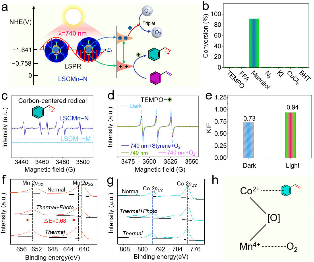 机理研究表明,在LSPR效应作用下,LaSrCoMnO6在可见光的激发下即可产生大量的空穴和电子。其中,空穴活化苯乙烯得到苯乙烯衍生C+化合物是其环氧化的关键,而电子在温和反应条件下与吸附氧结合形成单线态氧,进而与Mn物种形成氧化中心,这两步分别促进了苯乙烯的转化和环氧苯乙烷的合成。