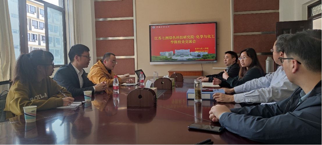 3月10日下午,江苏七洲绿色科技研究院有限公司来校举办2023年春季线下专场招聘会。会前,化工学院与江苏七洲绿色科技研究院有限公司在化工楼南221室进行合作交流。化工学院党委副书记、副院长冀秀芝、副院长张代林、副院长夏友谊、专业教师韩新亚教授及毕业班辅导员参加了此次会议。