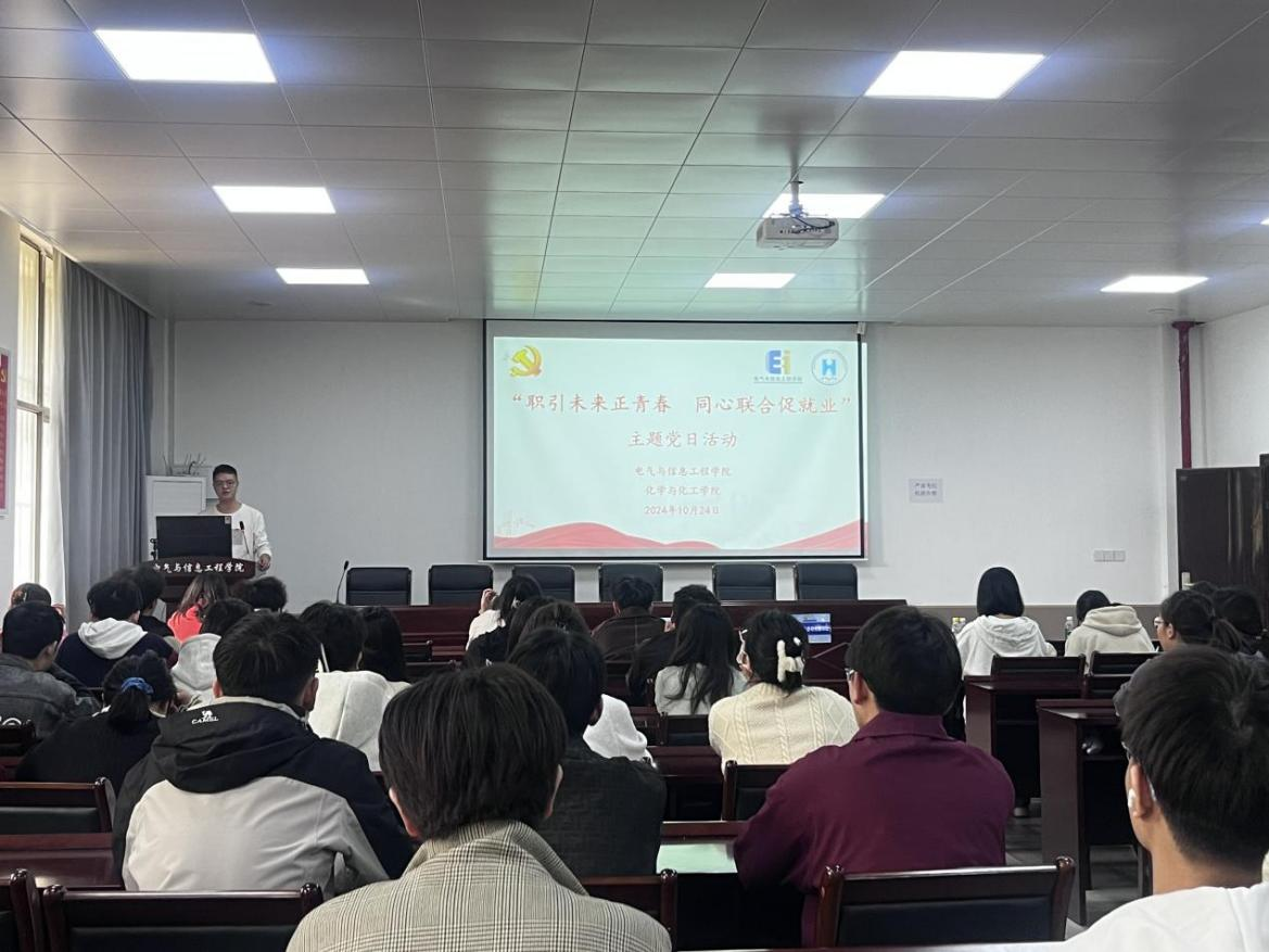 为学习贯彻党的二十届三中全会精神,帮助学生明确就业方向,提升求职技巧,规避求职误区。10月24日,体育彩票 高分子专业本科生党支部、应用化学专业本科生第一党支部与电气与信息工程学院学生测控党支部联合开展了“职引未来正青春,同心联合促就业”的主题党日活动。活动由电气学院学生测控党支部书记杨恒基主持,化工学院学生党支部书记王元云、徐静婕、两学院学生党员代表参加。