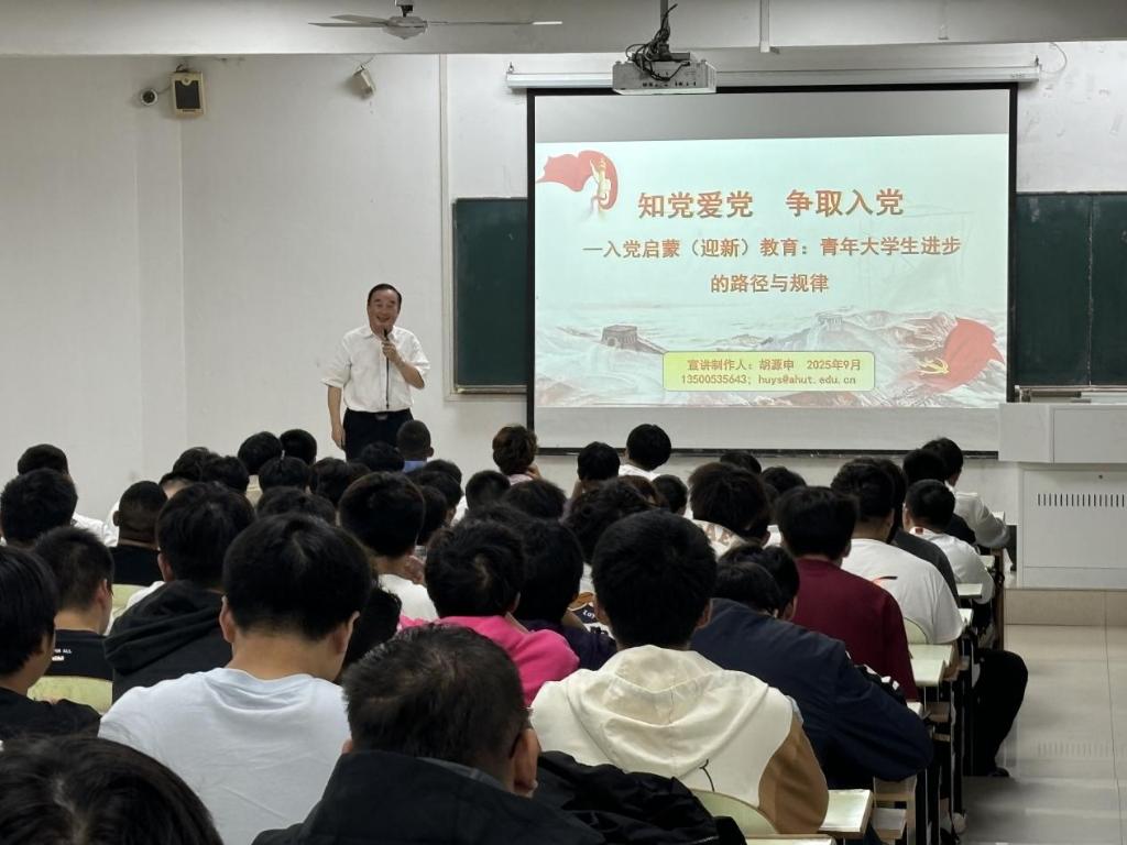 活动中,胡源申老师以“知党爱党 争取入党-青年大学生进步的路径与规律”为主题,深入讲解了中国共产党的性质、宗旨、光辉历程及新时代伟大成就,结合生动案例解读了坚持党的领导的重要意义,展现了党组织在国家发展和民族复兴进程中发挥的核心作用,帮助新生们端正入党动机,深刻理解“为何入党”这一根本问题。同时,详细介绍了大学生发展党员工作的具体流程与要求,包括申请入党的基本条件、标准及培养发展流程等。教育成效明显,活动结束后,许多同学纷纷表达了入党的强烈意愿。